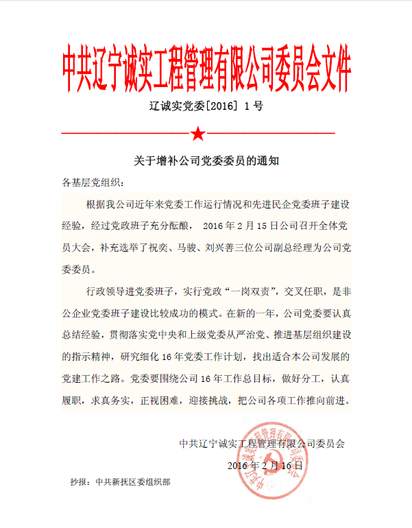 中共遼寧誠實工程管理有限公司委員會文件——關于增補公司黨委委員的通知