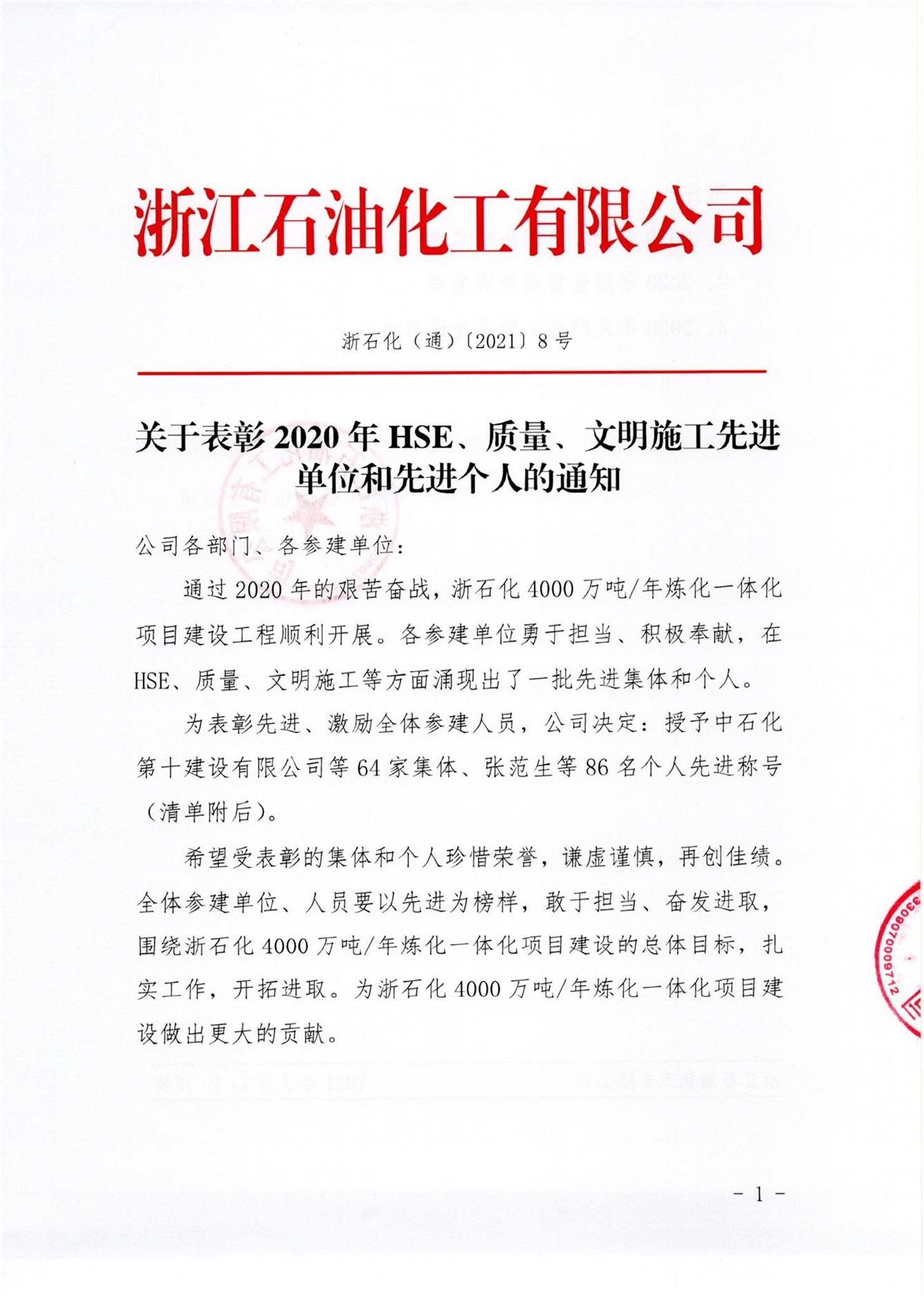 熱烈祝賀沈志強同志榮獲浙江石油化工有限公司4000萬噸/年煉化一體化項目“質量管理先進個人”榮譽稱號